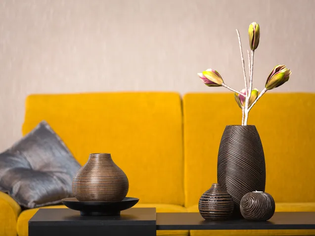 Doplňky imitující dřevo působí spolu se žlutou sedačkou harmonicky a útulně. Zdroj: eshop.sedackyphase.cz
