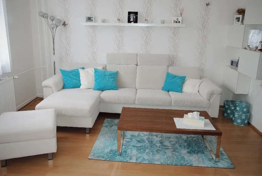 Chybí vám ráno energie? Zkuste si světlý obývák doplnit výraznější barvou. Ale zase ne moc intenzivní, aby stále převládala bílá barva, která všechny odstíny v pokoji sjednotí. Náš zákazník se nebál světle vytapetovanou stěnu a bílou rohovou sedací soupravu zkombinovat s jemnými tyrkysovými doplňky. Takováto svěží kombinace ho určitě motivuje k aktivitě hned na začátku dne.