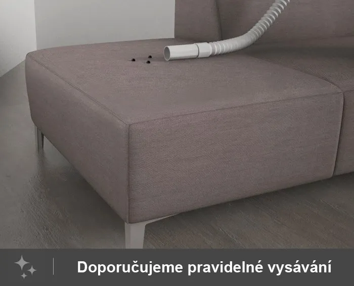Pravidelnou péčí oddálíte přirozené stárnutí sedačky. Nejjednodušší formou čištění sedaček je vysávání. Zbavíte tak potah usazeného prachu, drobků a jiných nečistot. Doporučujeme sedačku vysát jednou za týden, ideálně na nízkém výkonu vysavače a za použití speciálního nástavce na čalounění. Důsledkem nepravidelného vysávání sedačky je vznik žmolků z nahromaděné špíny.